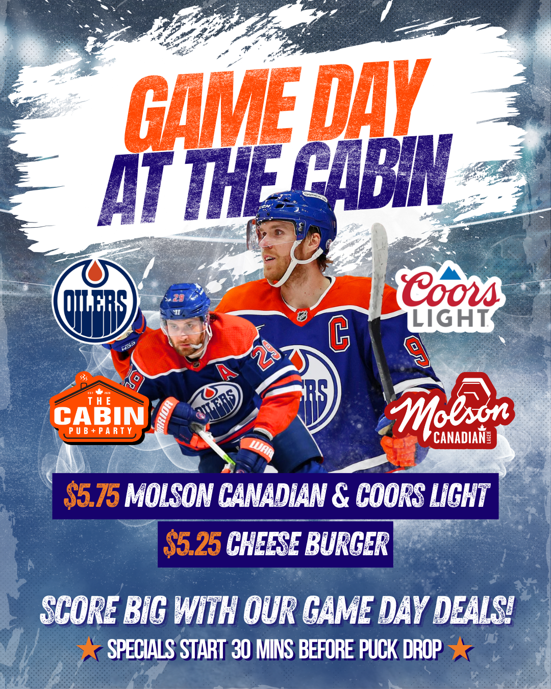 Catch the Oilers game on the big screen live at the Cabin and get in on our Game Day Special starting 30 minutes before puck drop: π $5.25 cheeseburgers πΊ $5.75 Molson Canadian or Coors Light