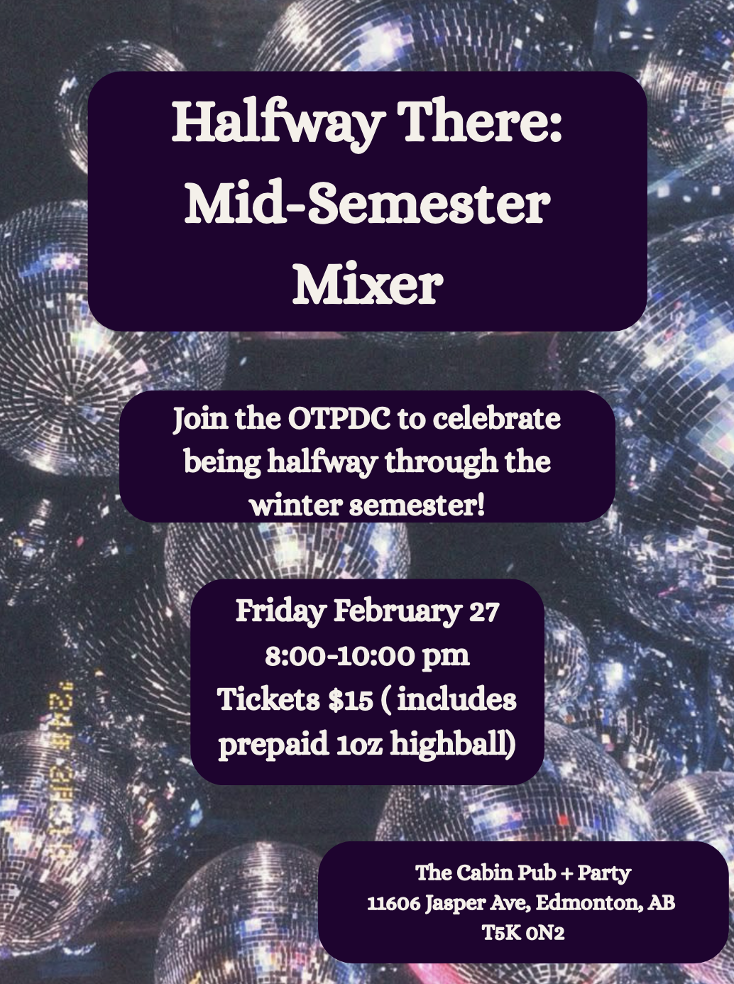 The Cabin 11606 Jasper Ave, EdmontonCelebrate the home stretch! Join the OTPDC for a night of disco vibes as we mark the midpoint of the winter semester. It’s the perfect time to take a break,...